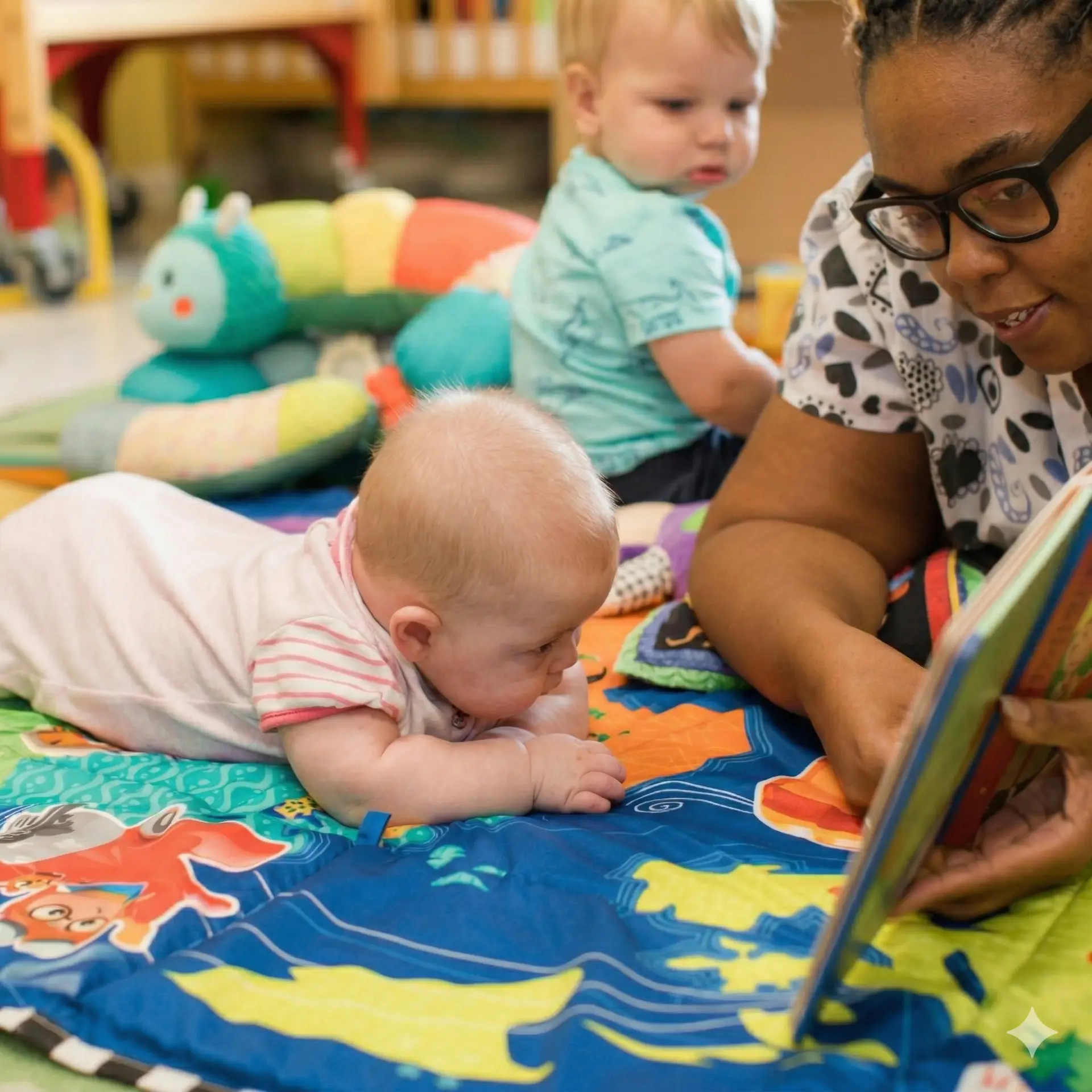Wondering if your baby will actually learn in daycare? We include age-appropriate activities like tummy time, music, books, and sensory play. These help build early motor skills, communication, and confidence. Your baby is learning and growing every single day.